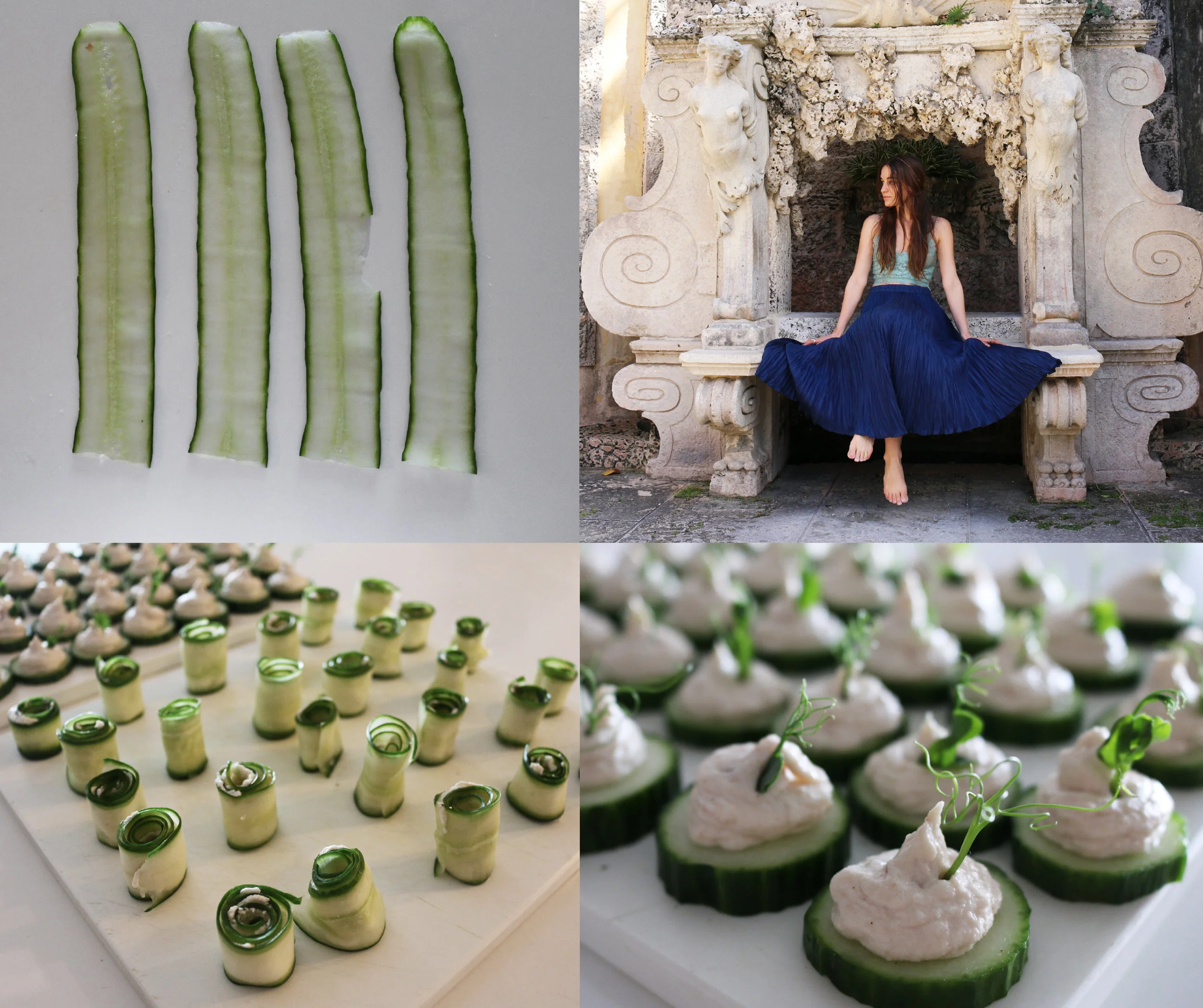 Spread a thin layer of goat cheese over one entire side of the cucumber slices and roll them up into spiral rolls.