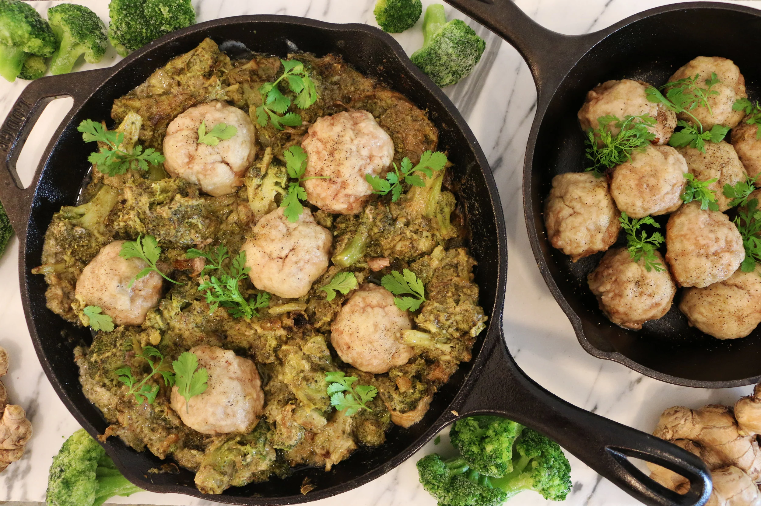 I love a good mushy caramelized vegetable, especially spiked with ginger. This recipe will make you love broccoli. Even (most) kids love this. The secret is to sautée the broccoli fleurettes with a lot of olive oil (lipids increase the absorption of nutrients in vegetables!) and grated ginger until they become caramelized. I like to cook the broccoli as long as patience allows, for about 30 minutes, until they’ve reduced in half and are crispy at spots. The turkey meatballs mirror the broccoli as they’re infused with quite a punch of ginger. This recipe is also perfect for sensitive stomachs. The high fibre content in the broccoli helps to balance the digestive system. The mushy vegetable cooking method and the ground turkey meat also make for faster digestion along with the stomach soothing ginger. This is one of my favorite comfort/sick day recipes or when I just need an extra dose of energy. Broccoli is a super food charged with a range of nutrients and antioxydants and the turkey offers a large dose of protein and essential B-vitamins.